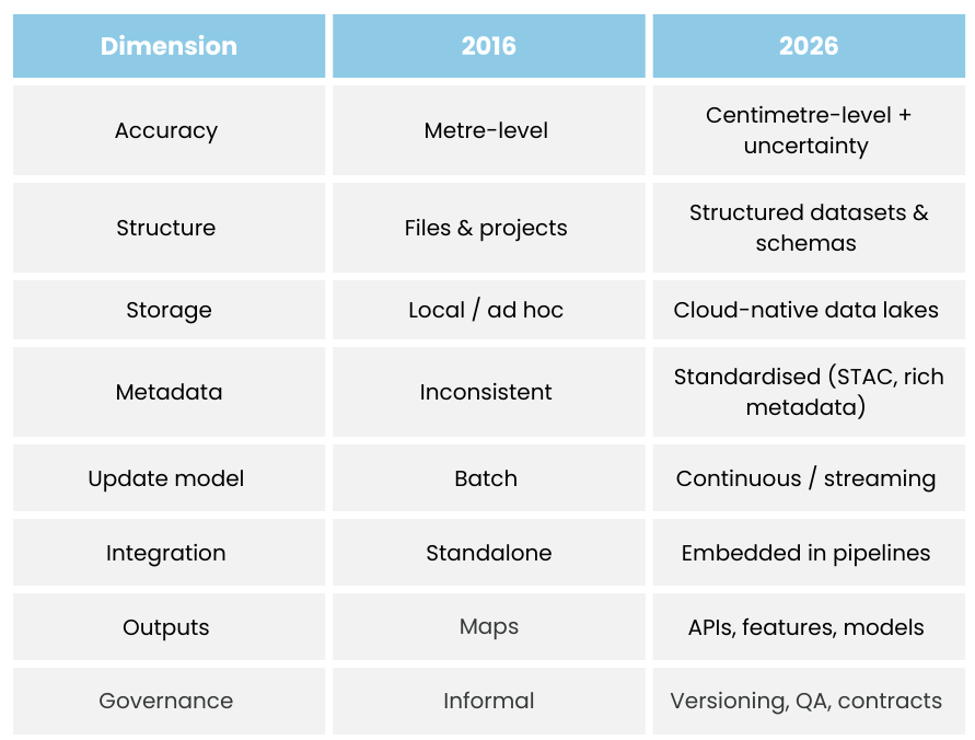 Location data now powers everything from climate modelling and insurance pricing to logistics optimisation and AI systems. But this didn’t happen overnight. The way geospatial data is collected, structured, managed and consumed has changed dramatically since 2016.