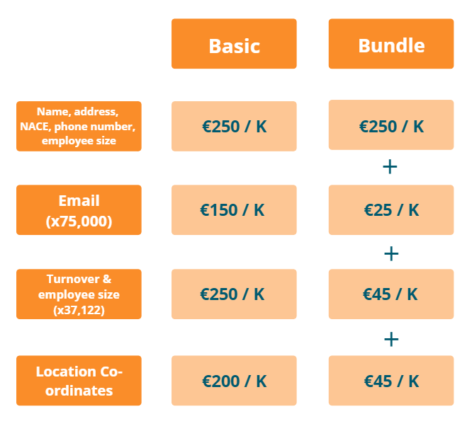 You can include the business name, address, NACE code, phone number and employee size, as well as emails, turnover & employee size, and location coordinates.
